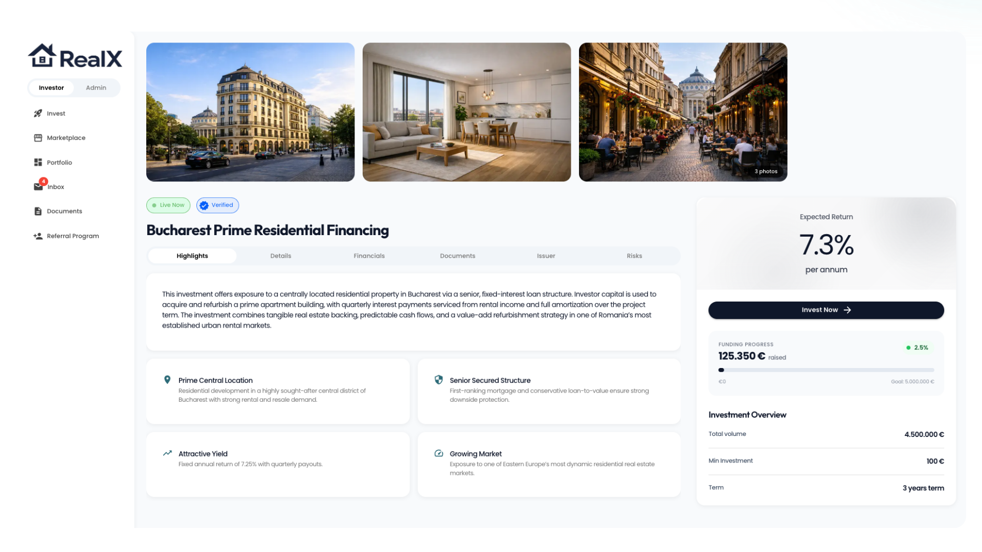 RealX is a white label platform expected to go live this quarter. It focuses on real estate in Romania, letting investors access fractional real estate exposure without having to buy whole properties themselves.